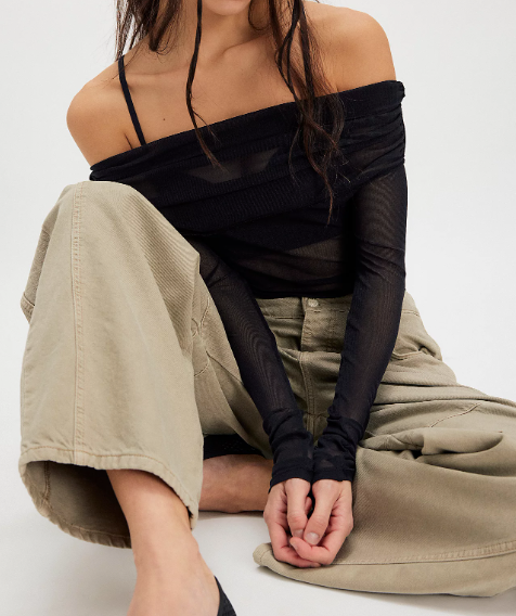 Features: Sheer mesh fabrication, off-the-shoulder neckline, fitted long sleeves, ruched cuff detail, button gusset