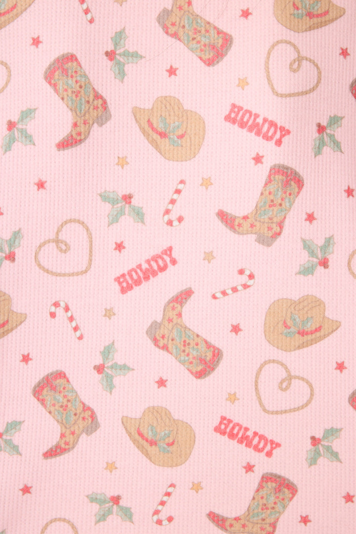 Kick back with a playful western twist in this pink two-piece pajama set. Crafted from baby peachy waffle, it features cowboy hats, boots, and stars across a long-sleeve top and boxer shorts—holiday lounging with a western spirit.