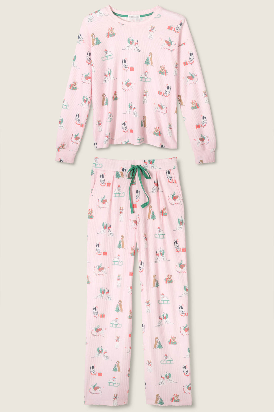 Deck the dogs with boughs of holly. Printed with pups in wreaths, lights, and festive gear, the long-sleeve crew top and drawstring pants bring cozy comfort with a playful twist that’s made for tree-trimming nights and Christmas-morning lounging.